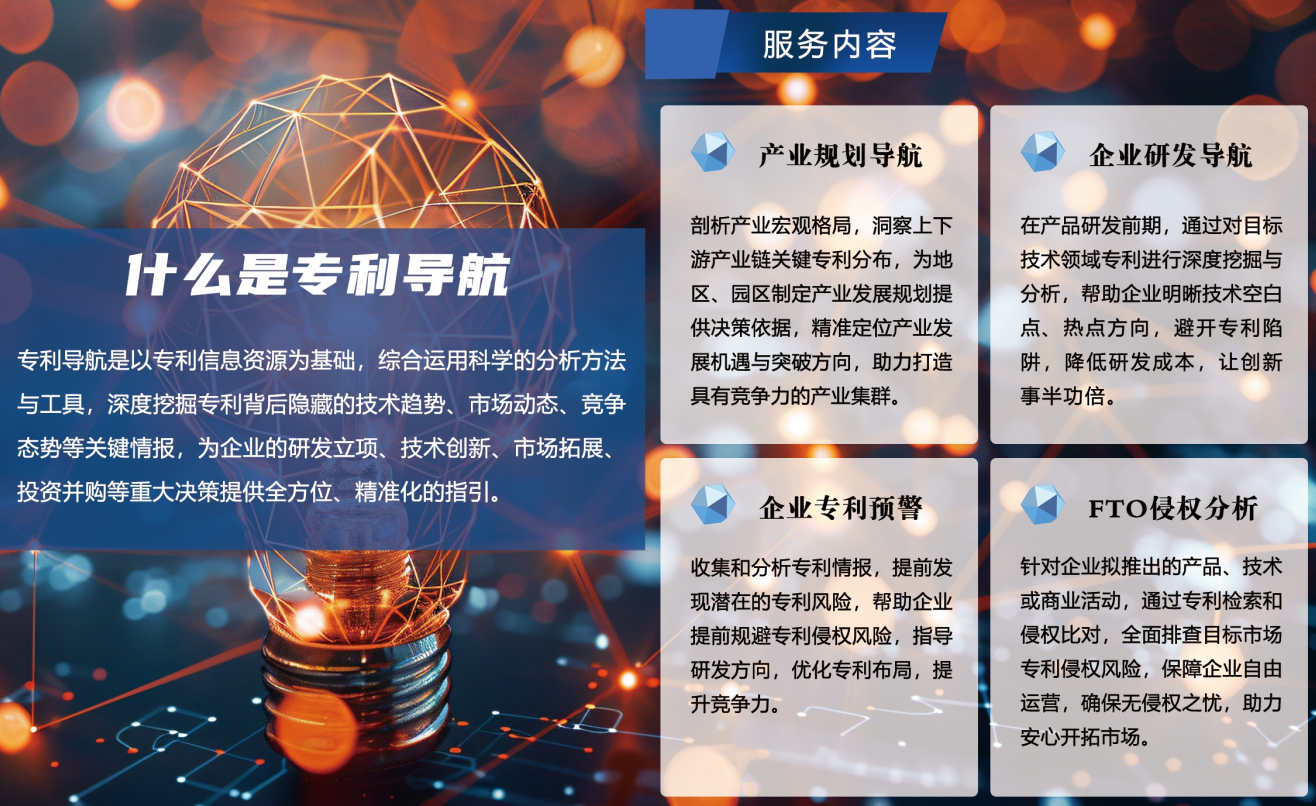 专利导航是以专利信息资源为基础,综合运用科学的分析方法与工具,深度挖掘专利背后隐藏的技术趋势、市场动态、竞争态势等关键情报,为企业的研发立项、技术创新、市场拓展、投资并购等重大决策提供全方位、精准化的指引。 FTO侵权分析是指在产品或技术已经初步定型的情况下进行的风险分析,其基本的模式是将所分析产品技术特征与第三方专利的权利要求技术特征进行对比,以判断所分析产品的技术方案是否落入目标专利权利要求的保护范围,为企业产品或技术研发提供保驾护航。